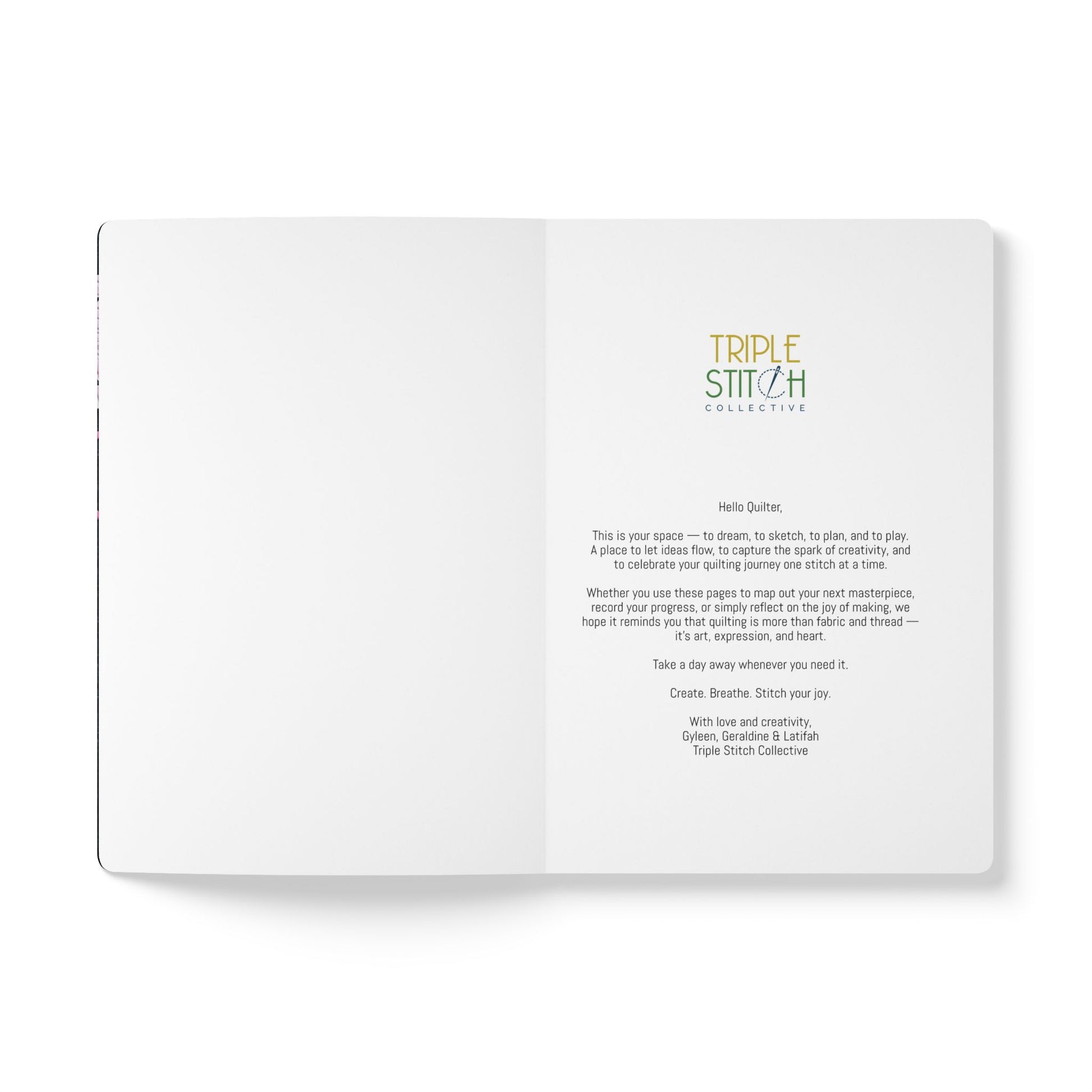 The Geraldine Edition of the A Day Away Journal is a thoughtfully crafted softcover notebook, designed for quilters, makers, and anyone who loves to capture inspiration as it unfolds. Whether you’re documenting your latest quilt project, sketching new design ideas, or writing notes from a day in the studio, this journal is your creative companion.