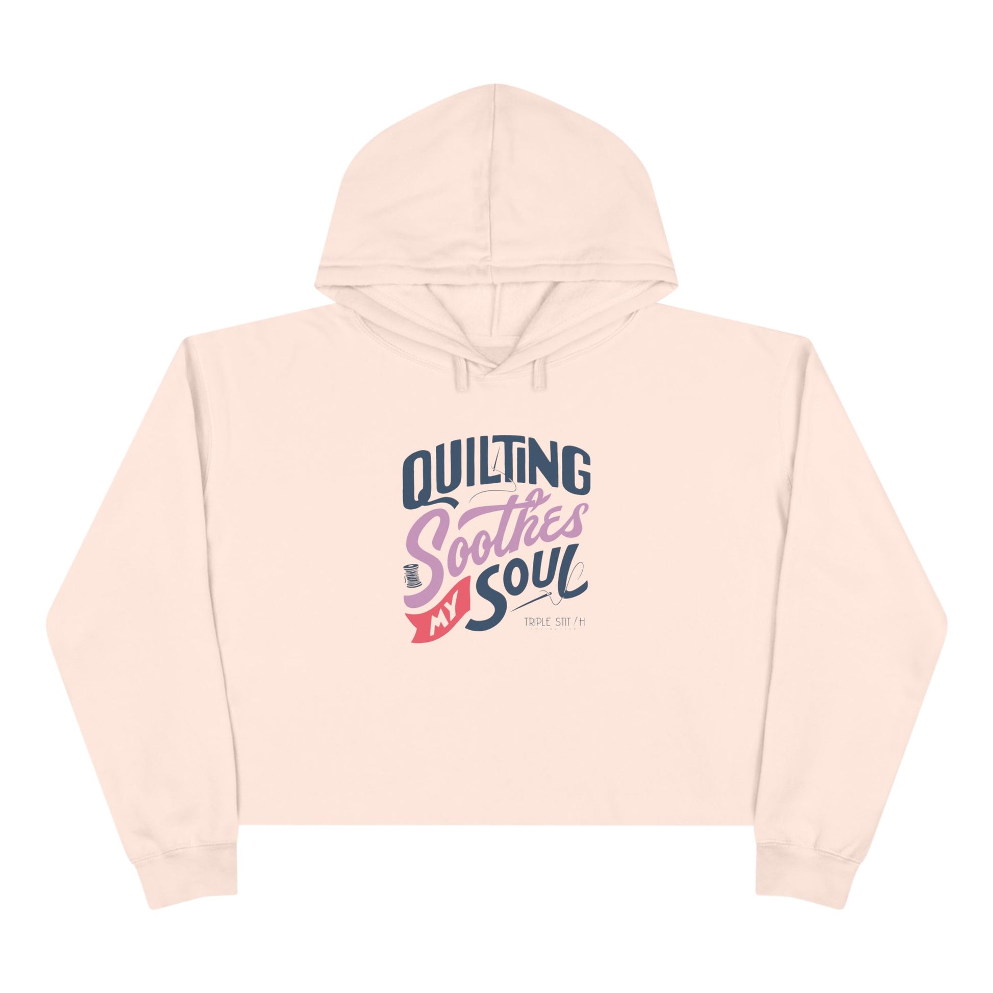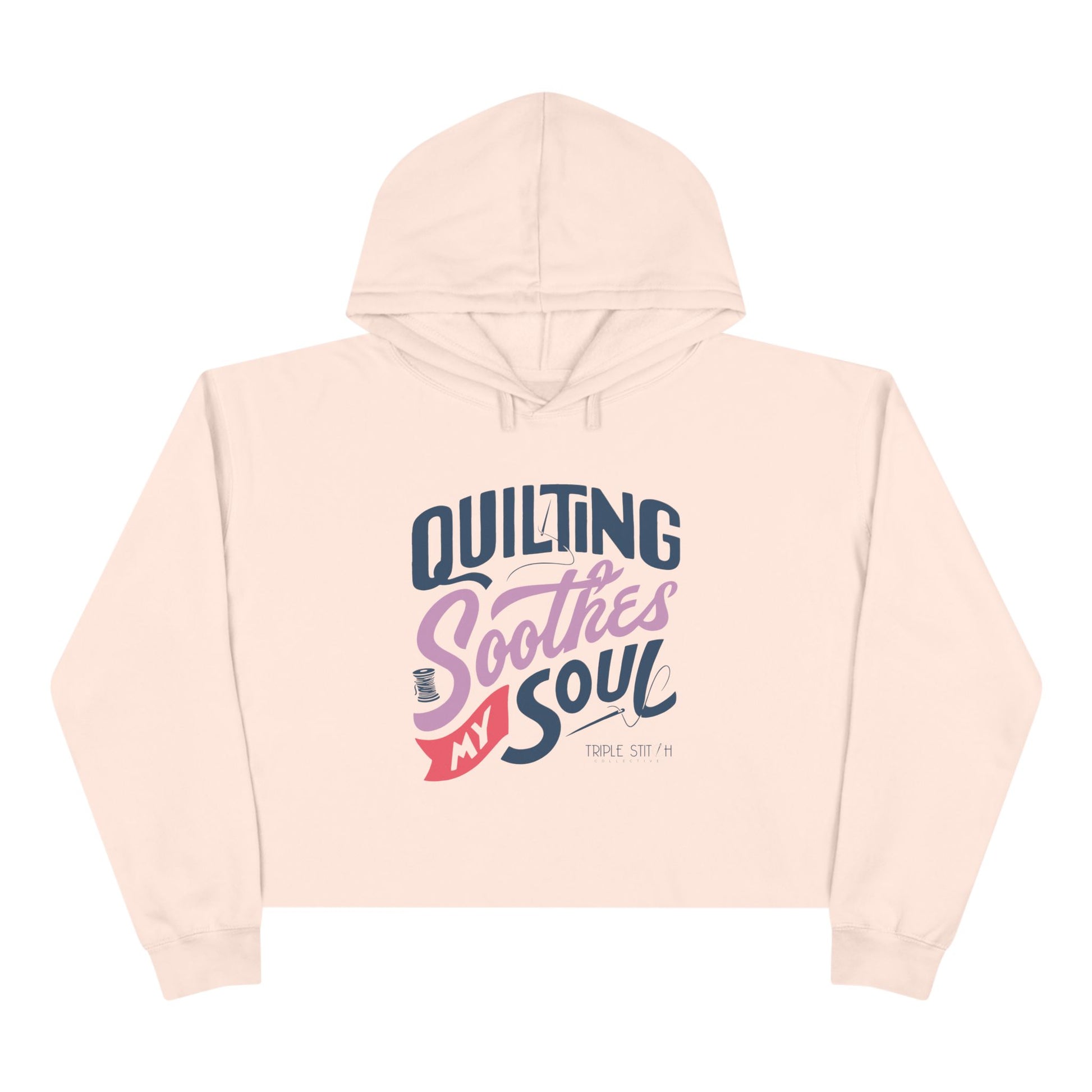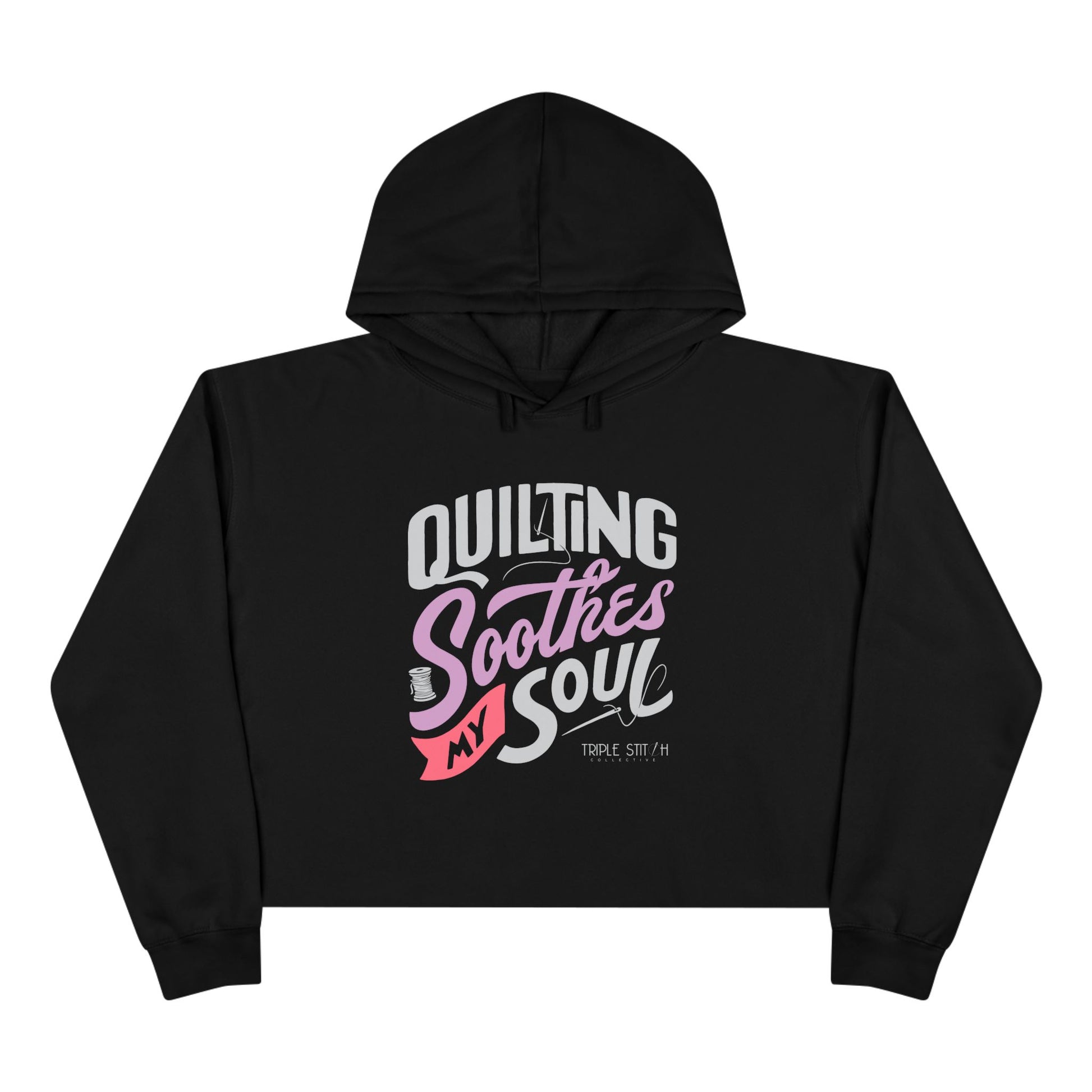 Equal parts comfort and craft, this cropped hoodie celebrates the quiet rhythm of quilting life. With its raw hem, cozy fleece, and full-chest “Quilting Soothes My Soul” print, it’s made for the moments when your sewing time becomes self-care.