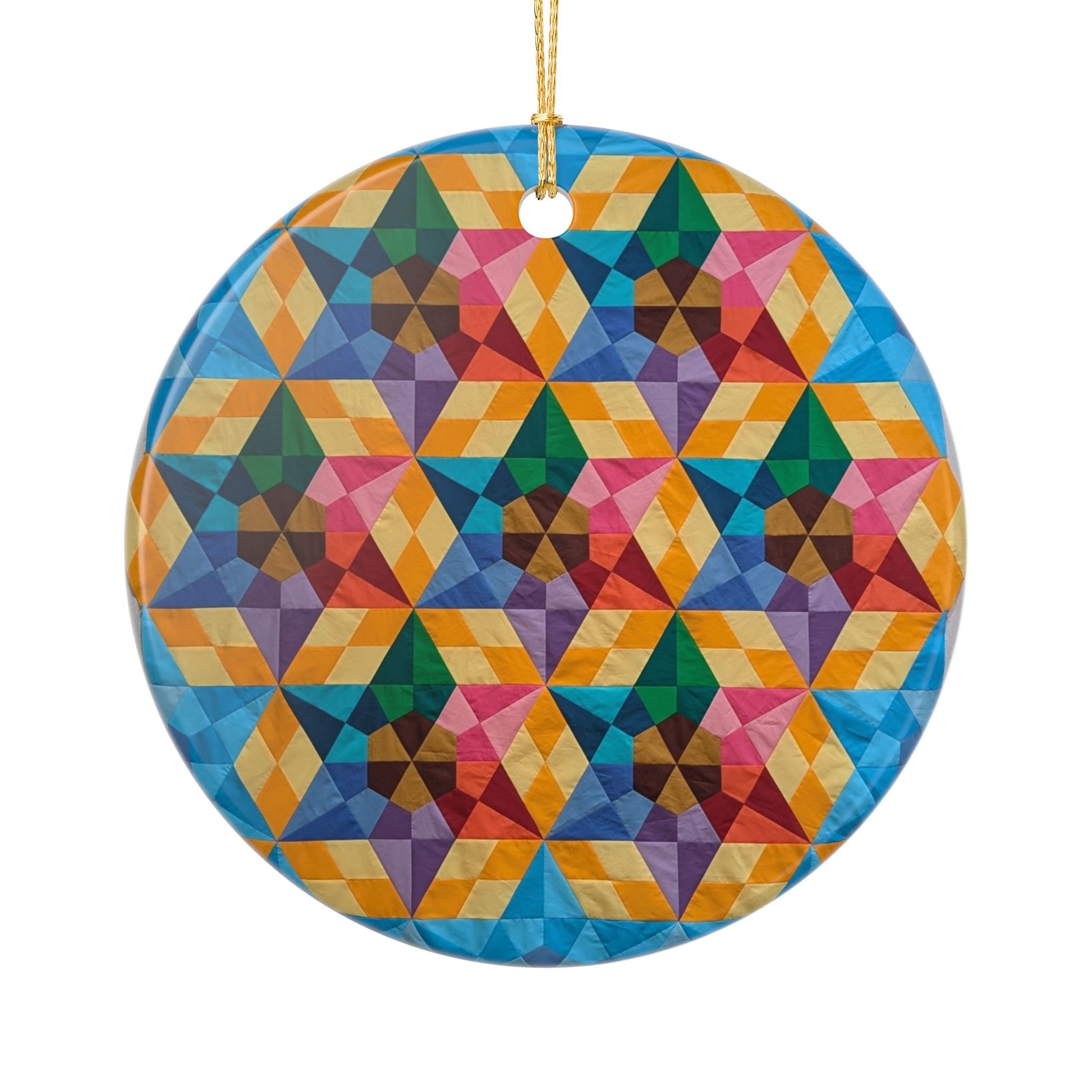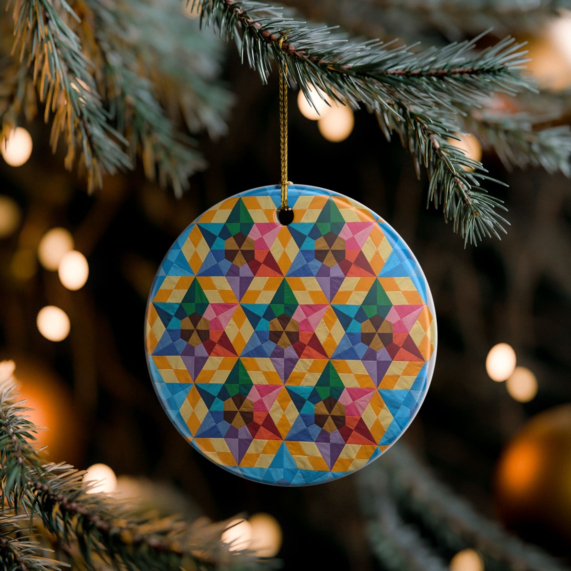 Celebrate the artistry of quilting in a form made to shine. This glossy ceramic ornament highlights Gyleen Fitzgerald’s intricate quilt design — a modern expression of balance, geometry, and creative joy. With smooth double-sided printing and a gold hanging string, it adds a polished, handmade accent to any space.